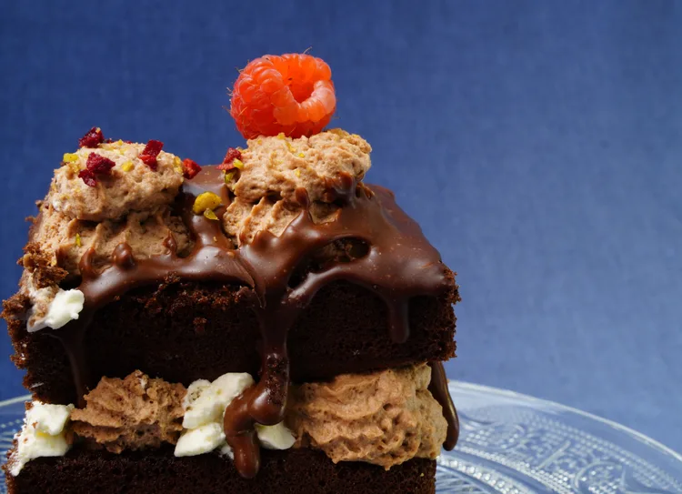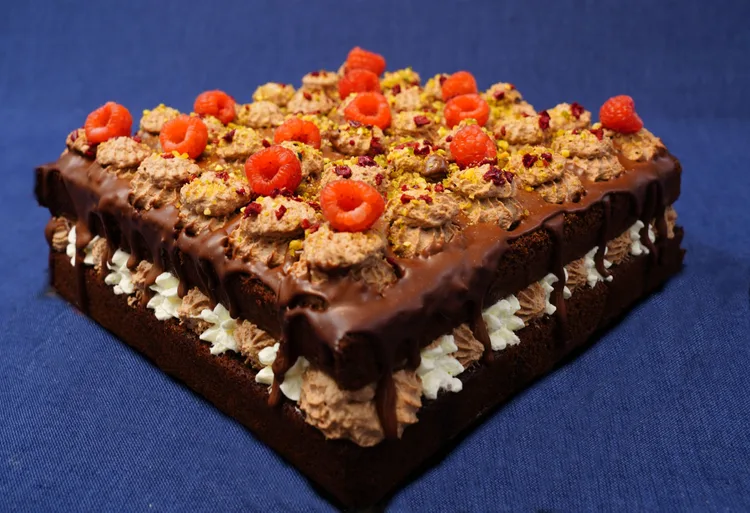 De taart is gevuld met chocolade mousse en echte amarena kersen, getopt met chocolade glazuur en vers rood fruit.